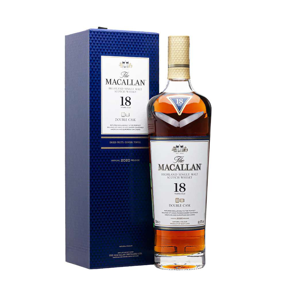 Macallan 18 năm Double Cask, Được làm bằng cách pha trộn rượu Single Malt whisky 18 tuổi từ các thùng gỗ sồi sherry Oloroso châu Âu và Mỹ, cả hai đều được tẩm ướp với thùng sherry chính thương hiệu Macallan, đây là một loại mạch nha đơn, ấm áp và là đỉnh cao của dòng Double Cask của Macallan.